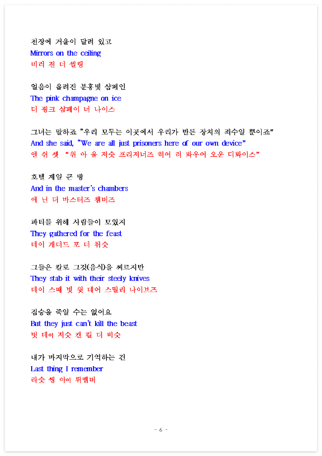노래 가사를 보면 대부분 아는 단어이지만 소리로만 들어서는 무슨 말인지 못 알아듣는 경우가 많습니다. 이유가 여러 가지 있겠지만 무엇보다도 연음 현상과 강세, 그리고 음절에 대한 이해가 필요한 이유죠. 아래 영상을 보면서 Hotel California를 깊이 감상해 보시기 바랍니다.
