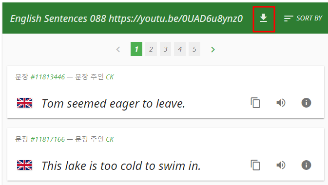 전체 문장을 확인하고 싶다면 아래 이미지처럼 화살표를 클릭해 보세요. 그러면 다음 화면으로 넘어가면서 모든 문장을 text 파일로 다운로드 받을 수 있는 화면이 나타납니다. 이것을 번역기를 활용하거나 혹은 자신의 실력으로 해석해 봅니다.