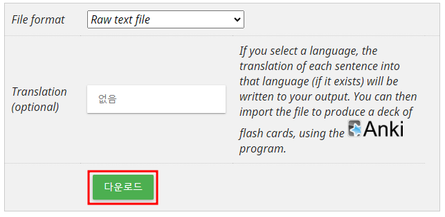 전체 문장을 확인하고 싶다면 아래 이미지처럼 화살표를 클릭해 보세요. 그러면 다음 화면으로 넘어가면서 모든 문장을 text 파일로 다운로드 받을 수 있는 화면이 나타납니다. 이것을 번역기를 활용하거나 혹은 자신의 실력으로 해석해 봅니다.