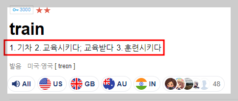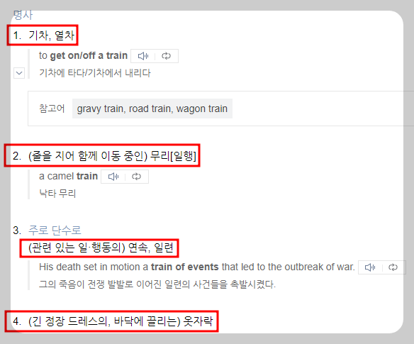 이렇게 무리를 지어 무언가를 뒤에서 나란히 줄지어 가는 모습이 train입니다. 이를 바탕으로 사전에는 어떻게 소개되고 있는지 확인해 보겠습니다.