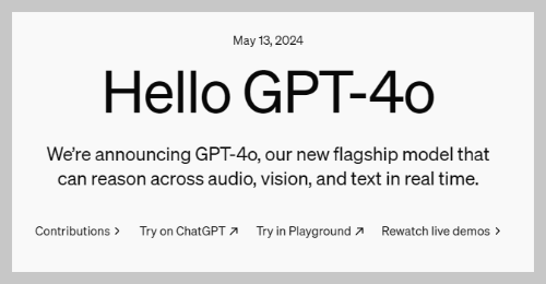 그런데 chatGPT4o라는 단어 끝에 있는 알파벳 소문자 o는 무엇일까요? OpenAI는 '모든 것'을 나타내는 라틴어 'omni'라고 했습니다. 즉, 인공지능 관련 모든 것이 이 안에 담겨 있다는 뜻이라 하겠습니다.