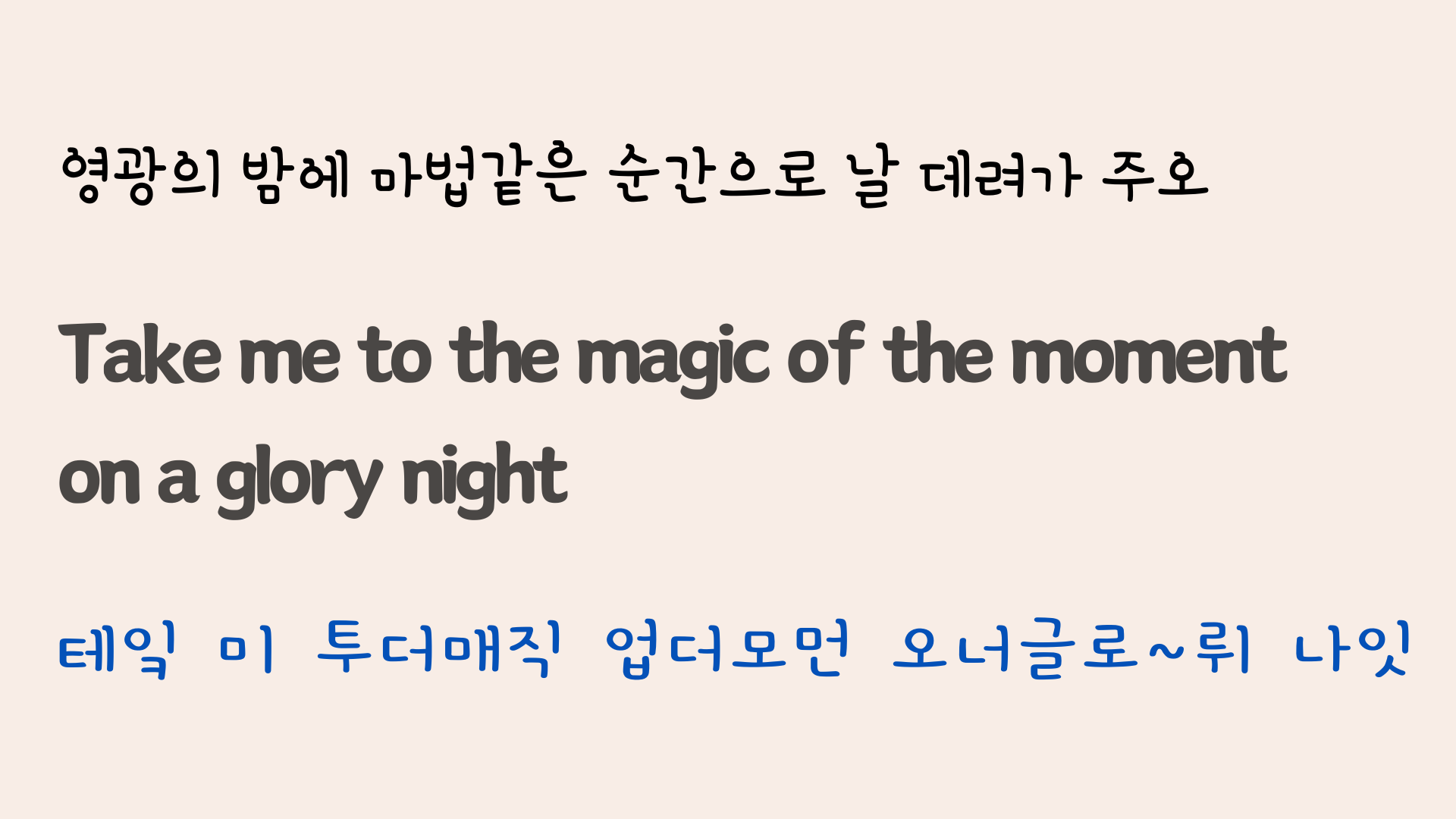 영상에 포함된 가사와 해석, 그리고 우리말 발음이 포함된 슬라이드입니다. 필요하시다면 다운로드하여 사용해 보셔도 좋겠습니다.