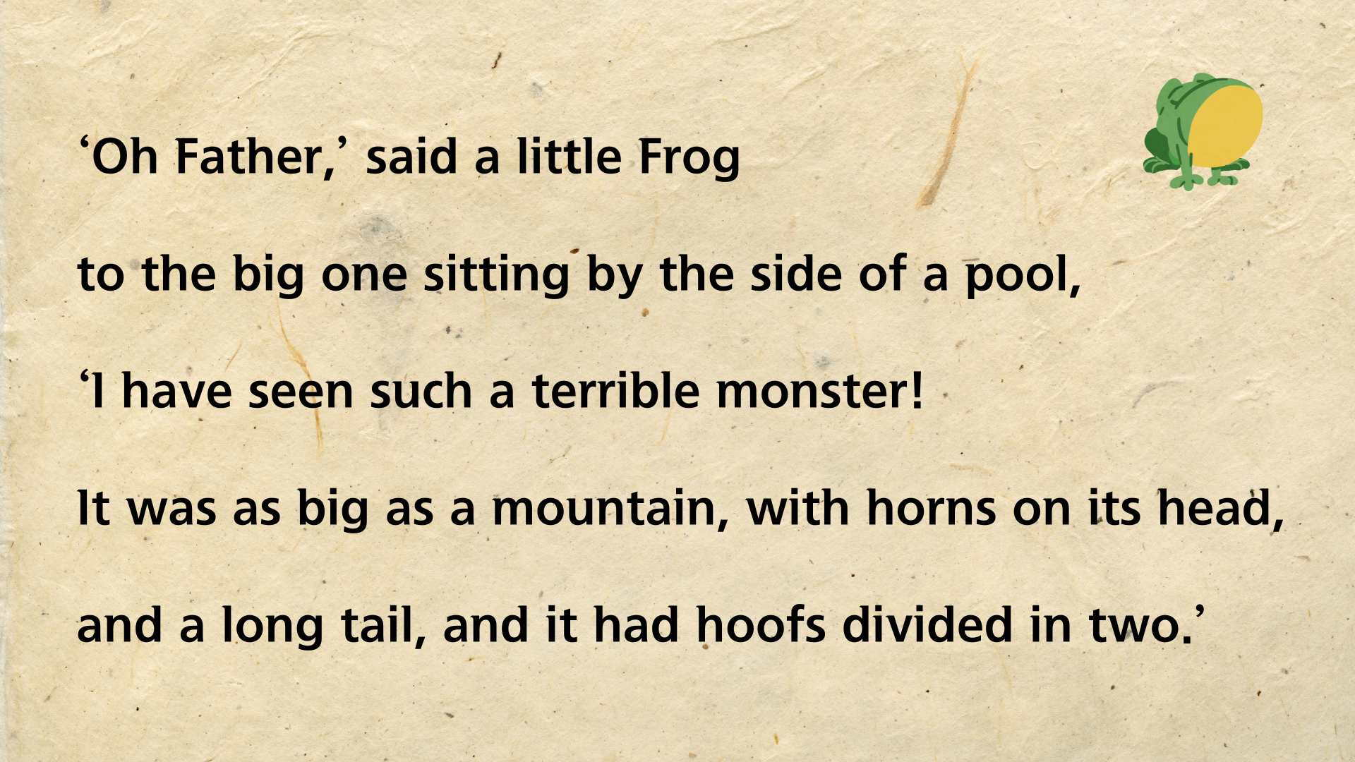 아기 개구리가 어느 날 자기보다 몸집이 몇 배나 더 큰 황소를 보게 됩니다. 난생처음 그렇게 큰 동물은 처음 보는 것이라 무척 놀란 듯합니다. 곧장 아빠 개구리에게 달려가 엄청 큰 괴물을 보았다고 하죠. 이 얘기를 들은 아빠 개구리는 자신이 황소만큼이나 클 수 있다며 몸을 크게 부풀이다 결국 빵 퍼진다는 내용입니다.