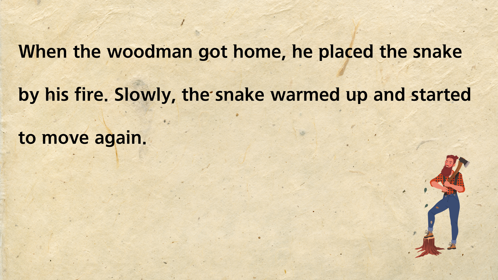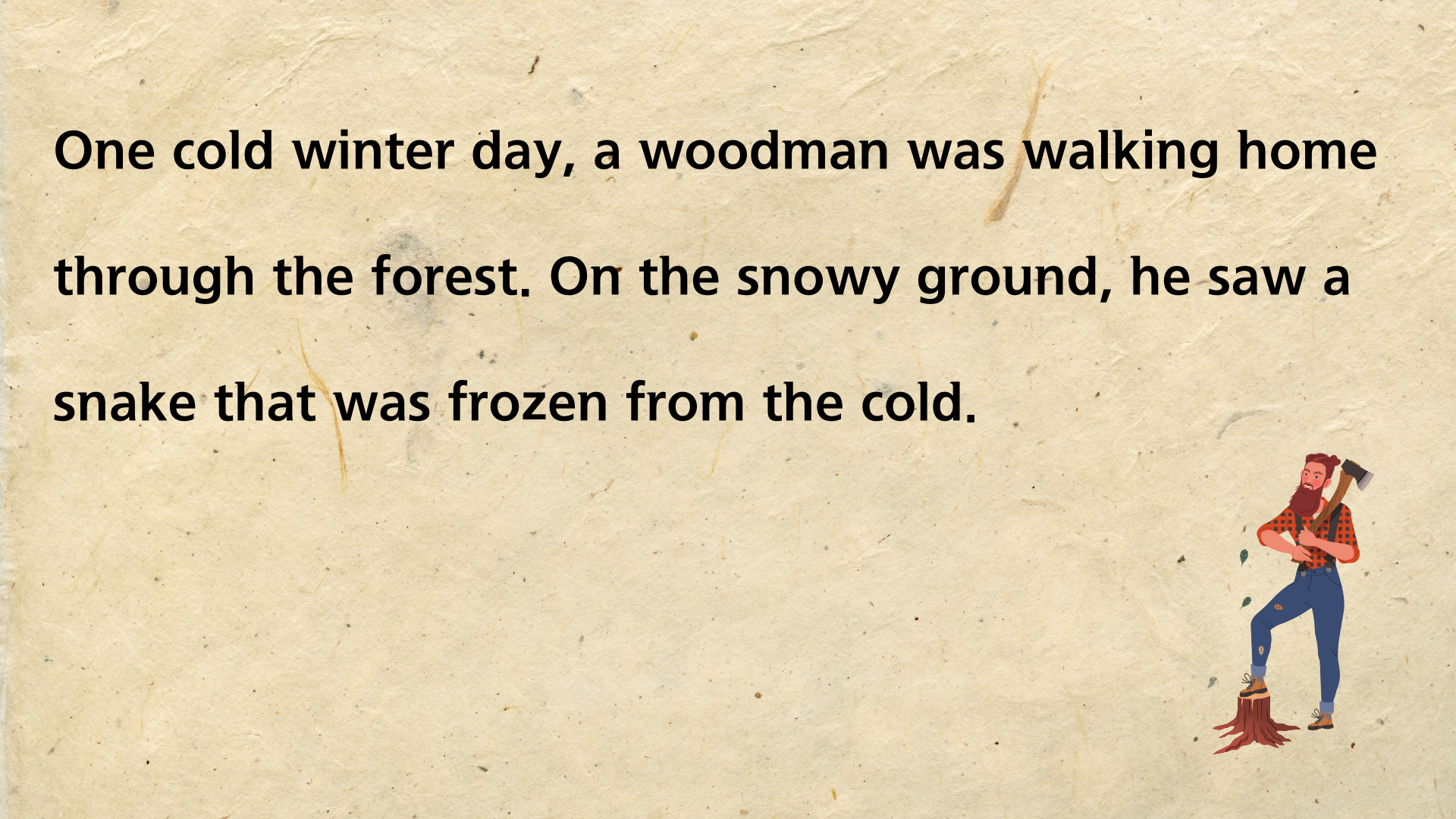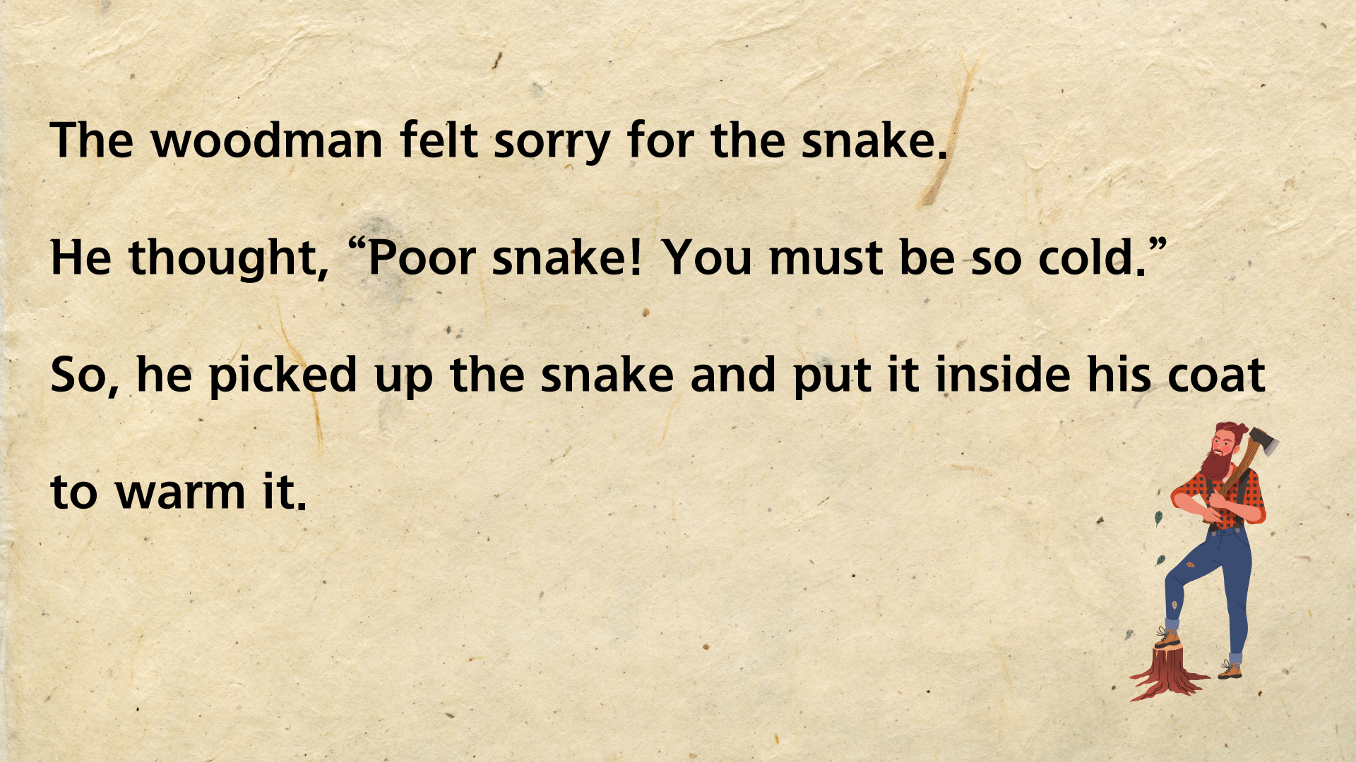 뱀은 겨울에 동면을 갖는 동물입니다. 그런 뱀이 추운 겨울날 길 위에서 얼어 죽은 듯 놓여 있는 것을 지나가는 나무꾼이 발견하죠. 불쌍한 마음이 든 나무꾼은 뱀을 코트 안에 넣어 집으로 데려옵니다. 그런 다음 따뜻한 불 옆에 놓아 몸을 녹여 주죠. 한참이 지나자 뱀은 굳었던 몸을 풀고 살아납니다. 하지만 자신을 구해준 나무꾼에게 고맙다는 말도 없이 되려 나무꾼을 물려고 하죠. 깜짝 놀란 나무꾼은 뱀을 집어 차가운 도로 위에 획 내던져 버립니다.