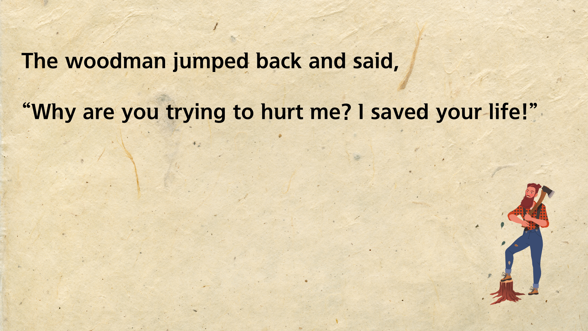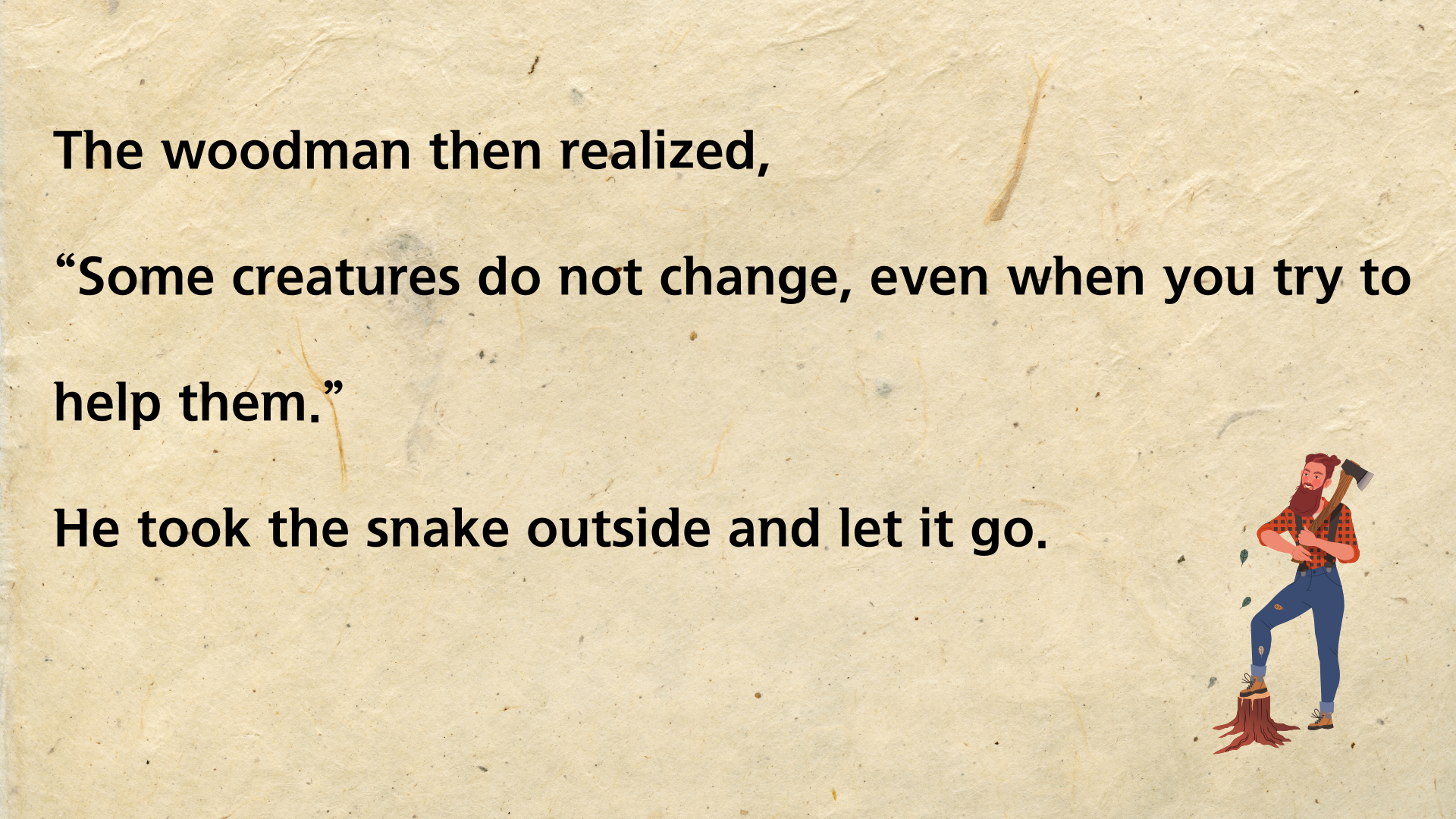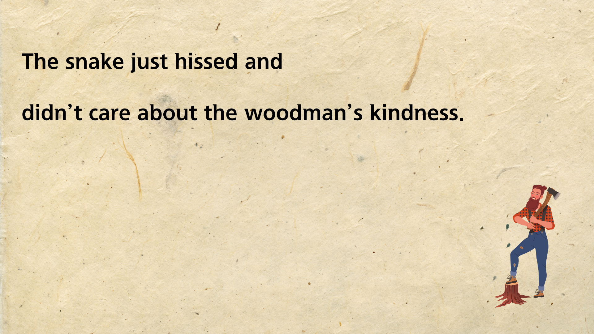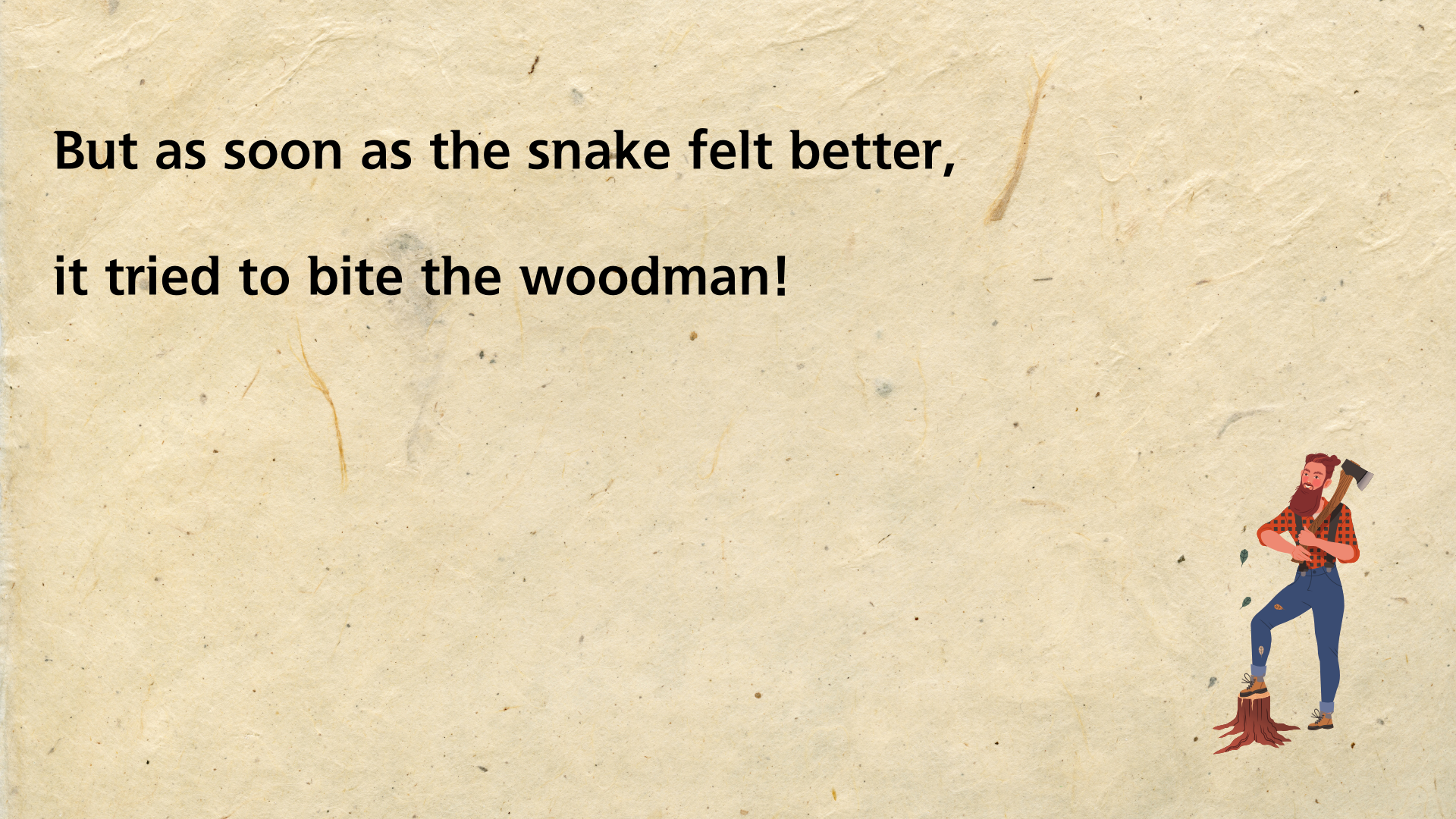 뱀은 겨울에 동면을 갖는 동물입니다. 그런 뱀이 추운 겨울날 길 위에서 얼어 죽은 듯 놓여 있는 것을 지나가는 나무꾼이 발견하죠. 불쌍한 마음이 든 나무꾼은 뱀을 코트 안에 넣어 집으로 데려옵니다. 그런 다음 따뜻한 불 옆에 놓아 몸을 녹여 주죠. 한참이 지나자 뱀은 굳었던 몸을 풀고 살아납니다. 하지만 자신을 구해준 나무꾼에게 고맙다는 말도 없이 되려 나무꾼을 물려고 하죠. 깜짝 놀란 나무꾼은 뱀을 집어 차가운 도로 위에 획 내던져 버립니다.