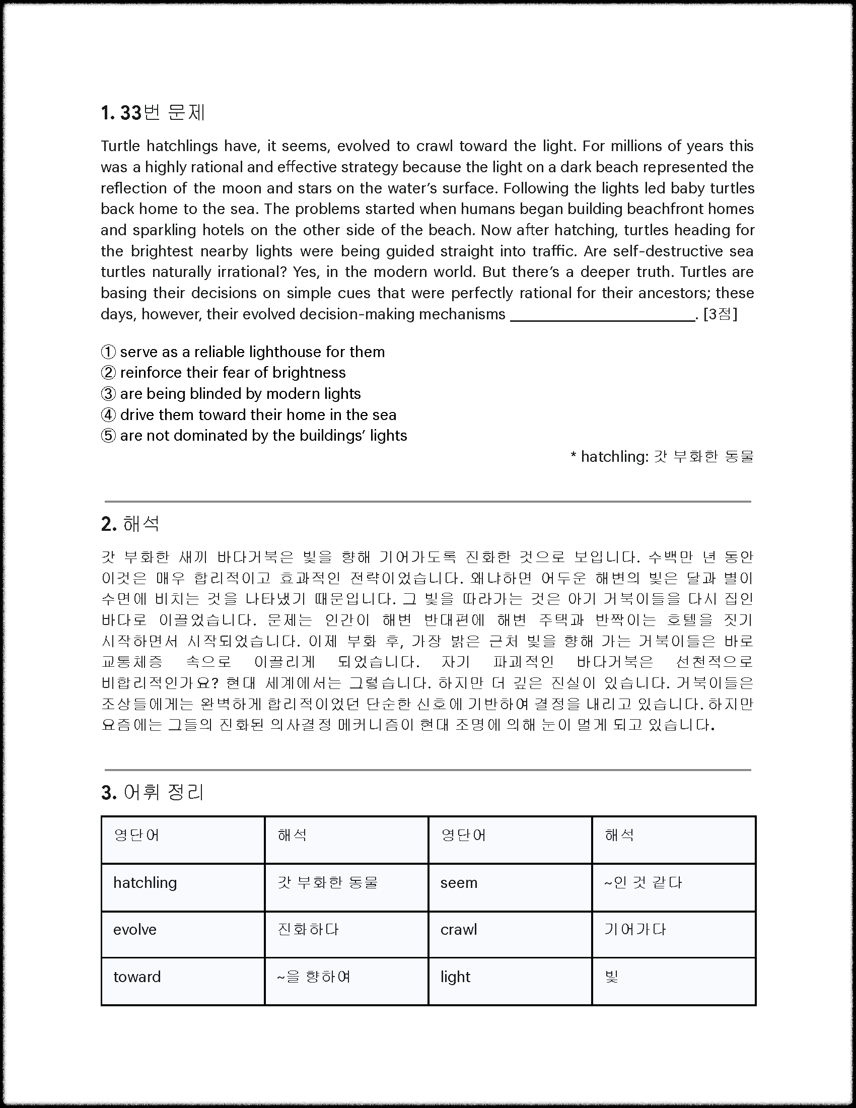33번 문제를 예시로 보여드립니다.18번에서 45번 전문항 해설 자료는맨 하단에 첨부해 놓았습니다.