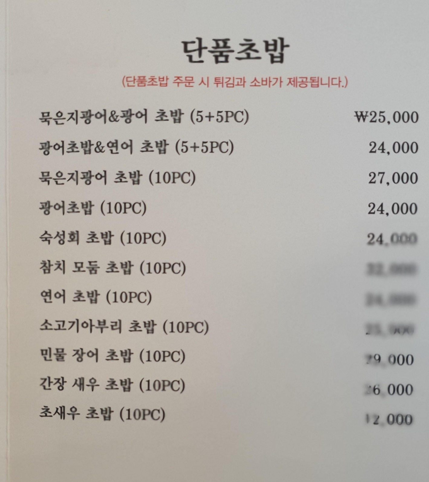 주문 후 곧바로 기본 반찬이 세팅됩니다. 아삭한 양배추 샐러드는 입맛을 돋우기 충분했고, 함께 나온 장아찌류도 깔끔하고 맛있었어요. 초밥과 곁들이기 딱 좋았답니다.