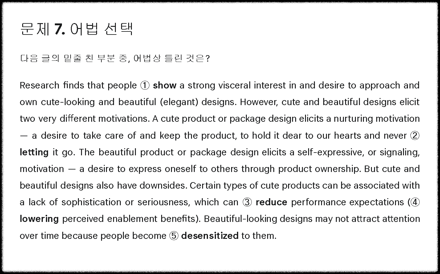각 지문당 빈칸, 삽입, 순서, 주제, 어법, 어휘, 요약 유형으로 만든 것입니다.