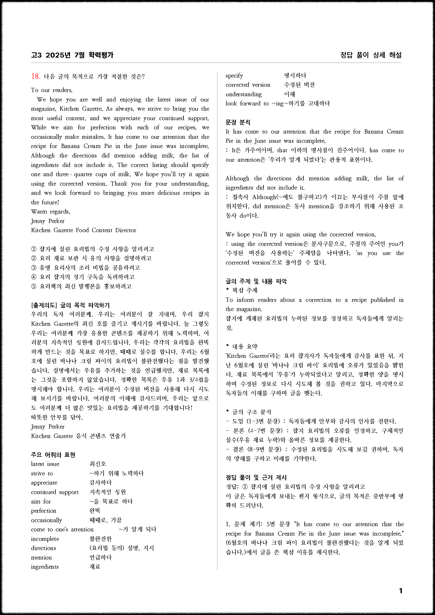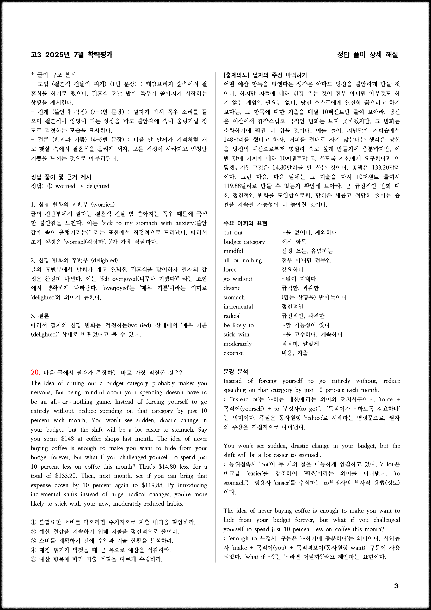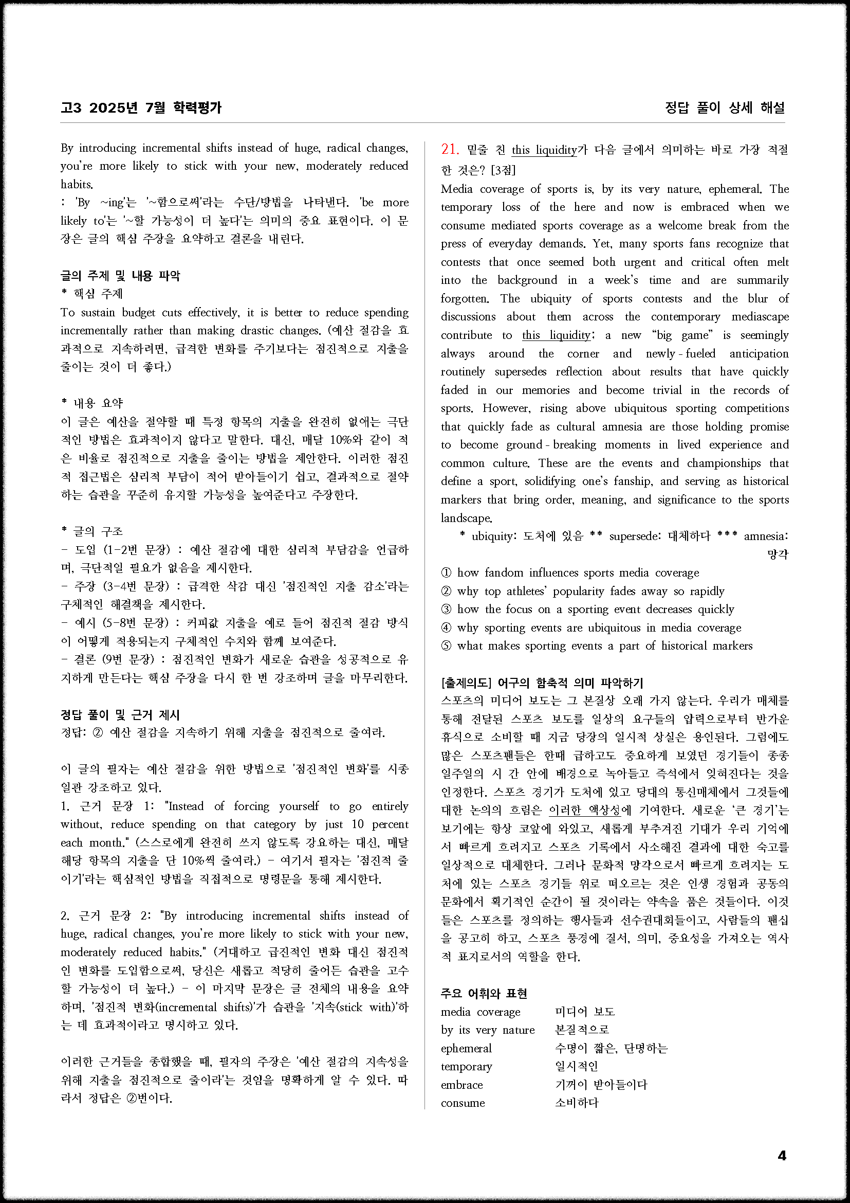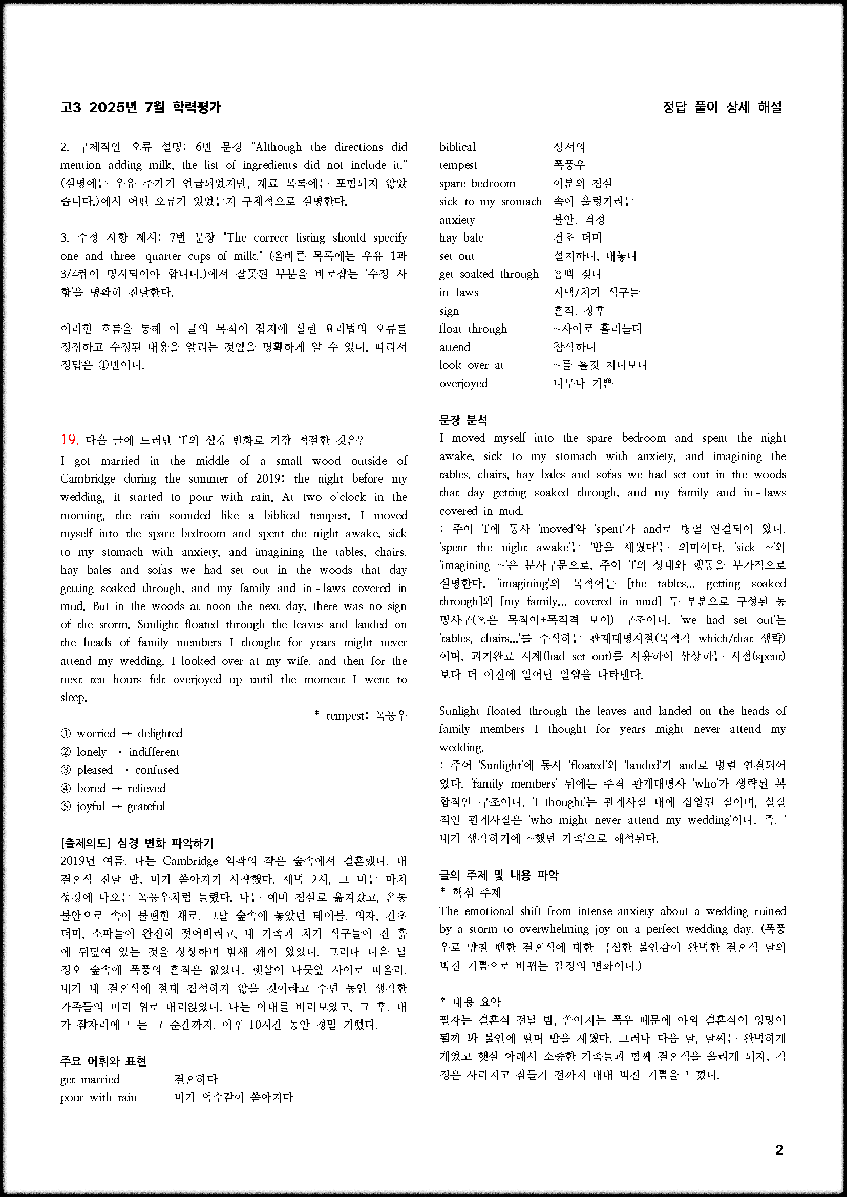 2025년 7월 학력평가 영어 모의고사 상세 풀이 해설집입니다. - 시험 지문 - 지문 해석 - 주요 어휘와 표현 정리 - 주요 문장 구문 분석 - 글의 주제 및 내용 요약 - 글의 구조 흐름 분석 - 정답 풀이