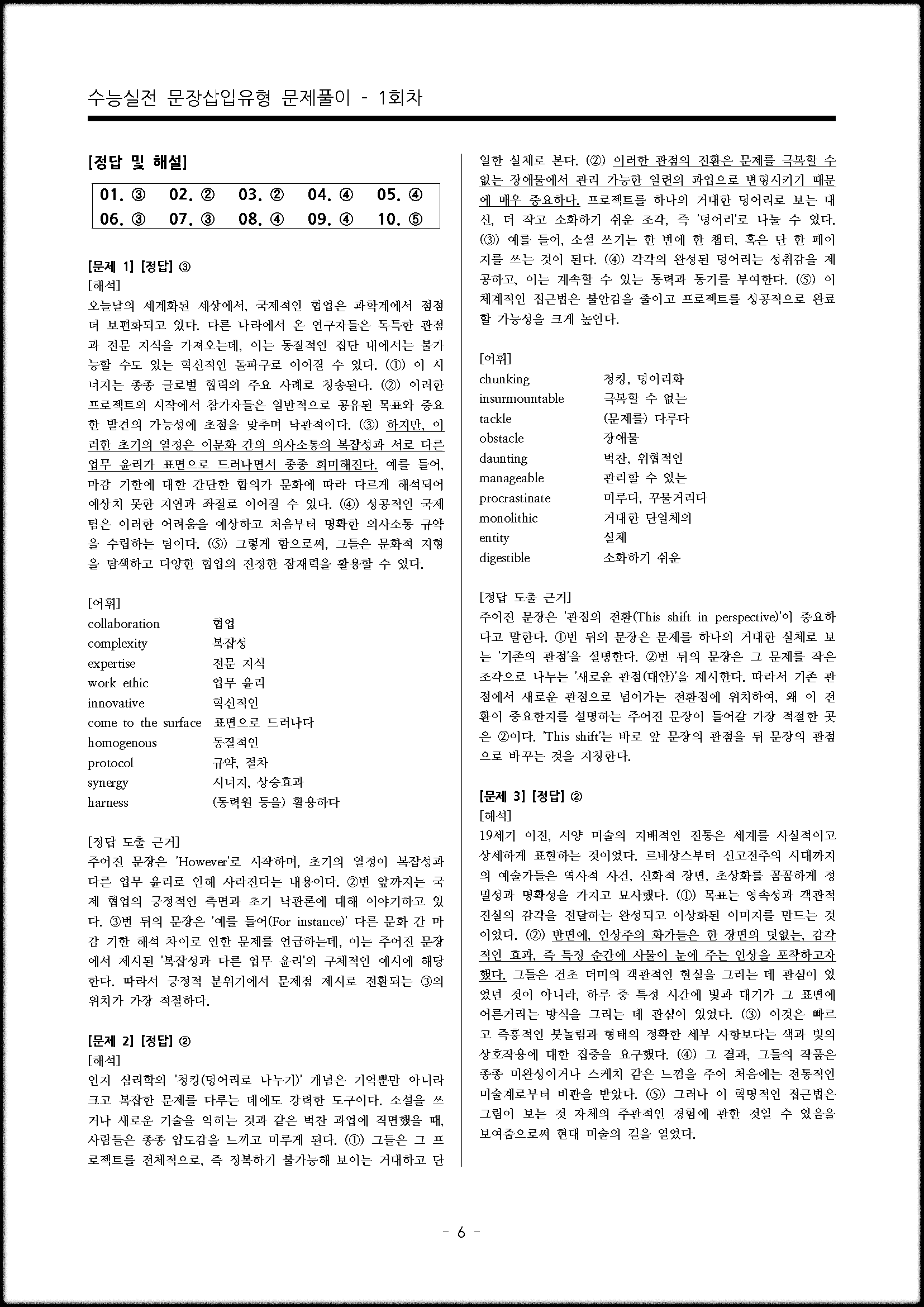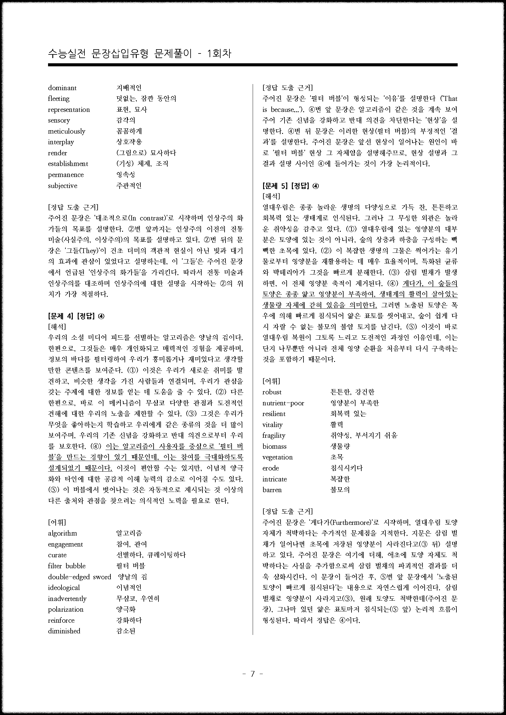 수능영어 문장삽입 유형 실전문제입니다. 단순히 문제를 풀고 답을 맞추기 보다는, 정답이 되는 근거가 무엇인지 꼼꼼하게 분석해 보면서 글의 논리적 흐름을 파악해 보기 바랍니다. 총 10회차