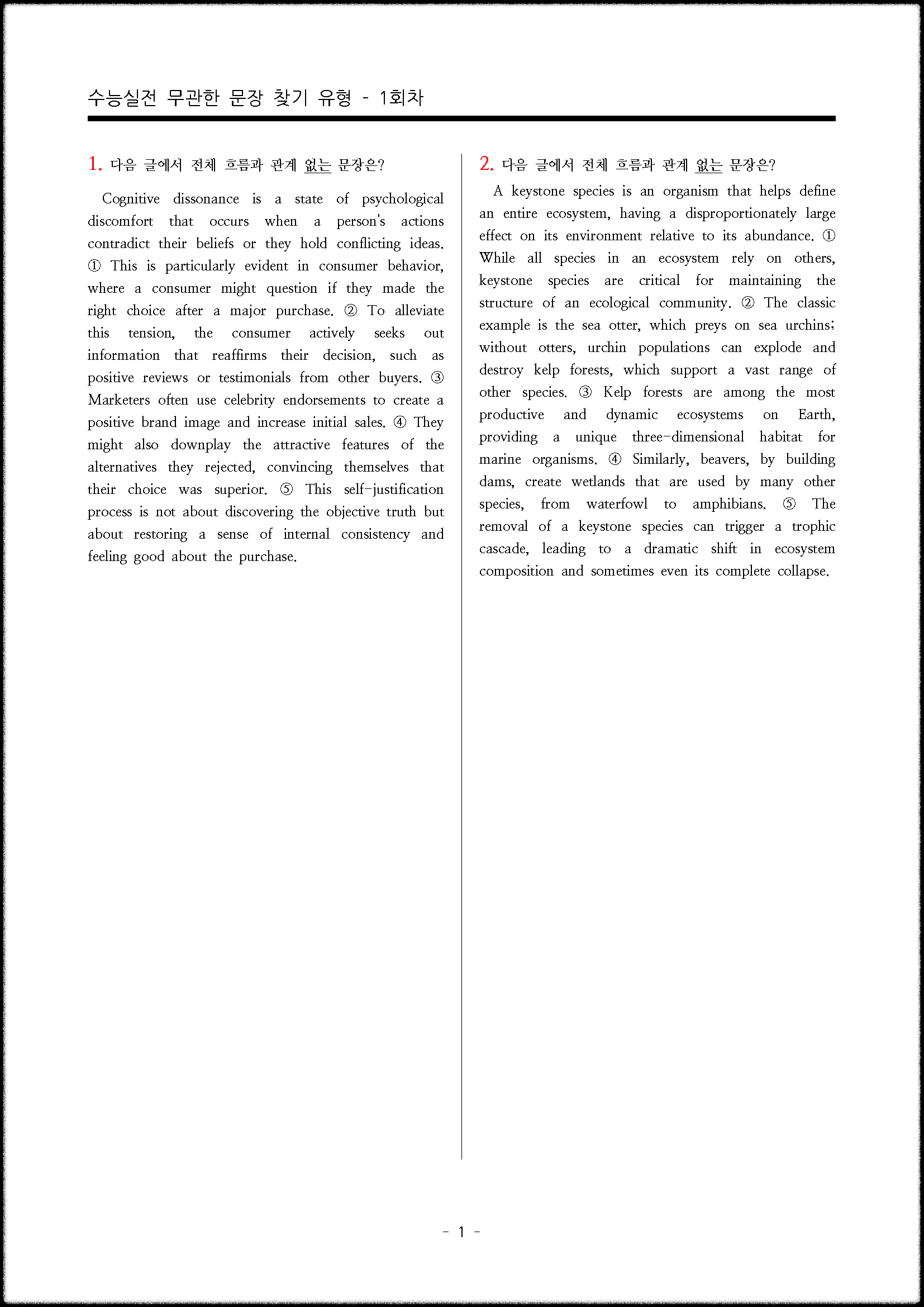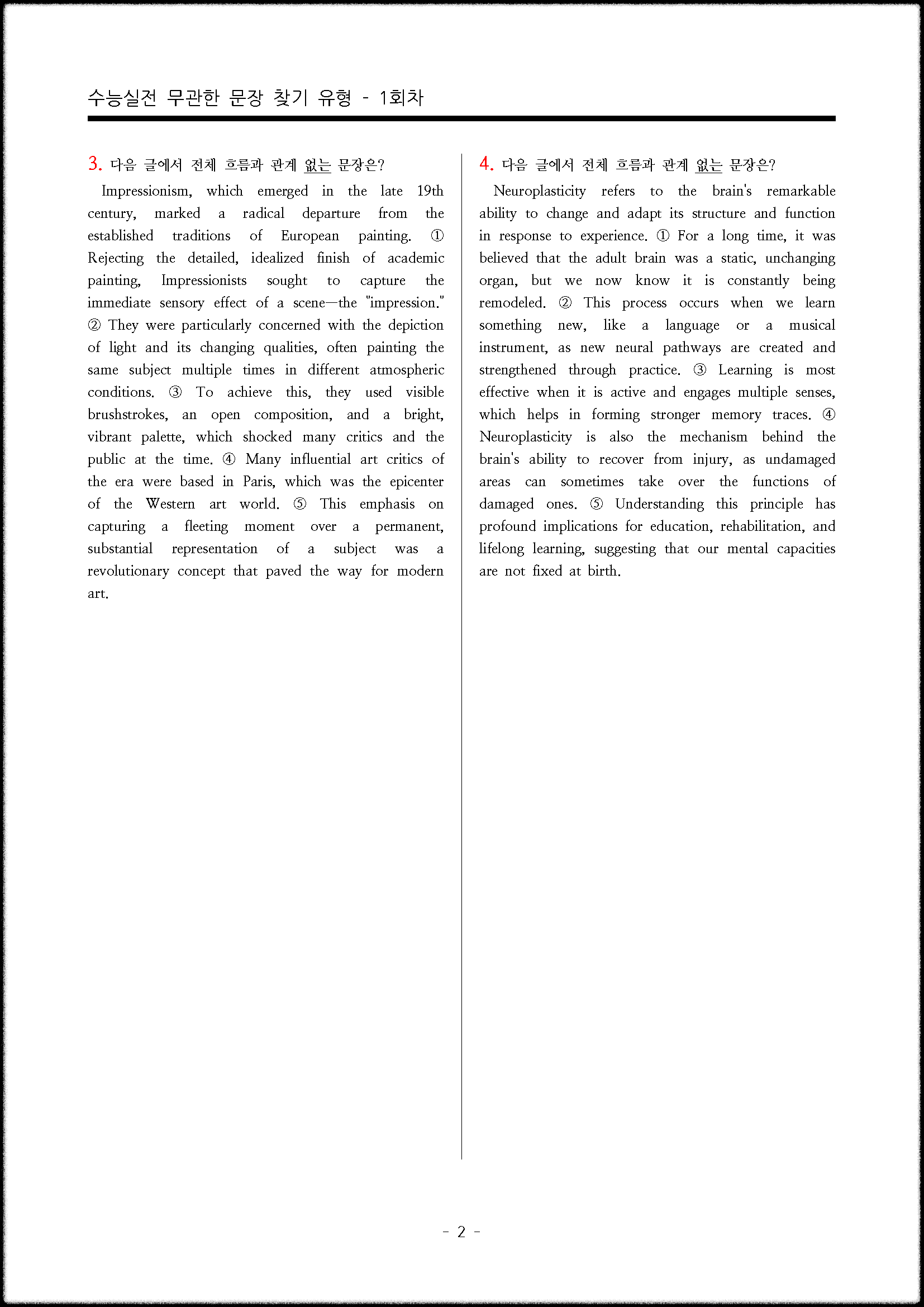 수능영어 무관한 문장 찾기 유형 100문항을 준비했습니다.