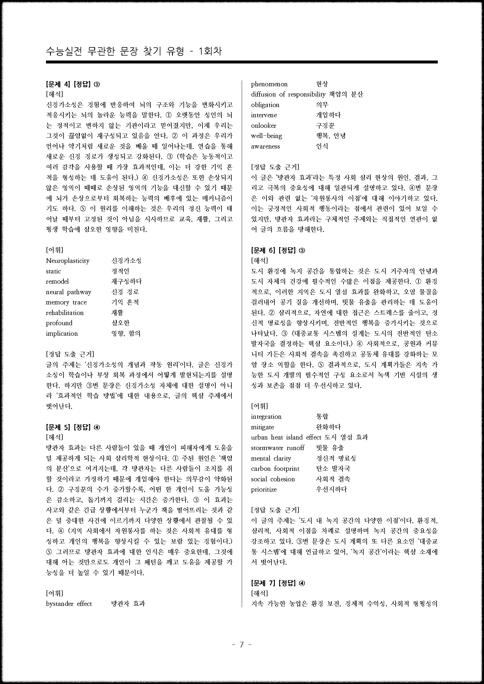 수능영어 무관한 문장 찾기유형 실전문제입니다. 단순히 문제를 풀고 답을 맞추기 보다는, 정답이 되는 근거가 무엇인지 꼼꼼하게 분석해 보면서 글의 논리적 흐름을 파악해 보기 바랍니다. 총