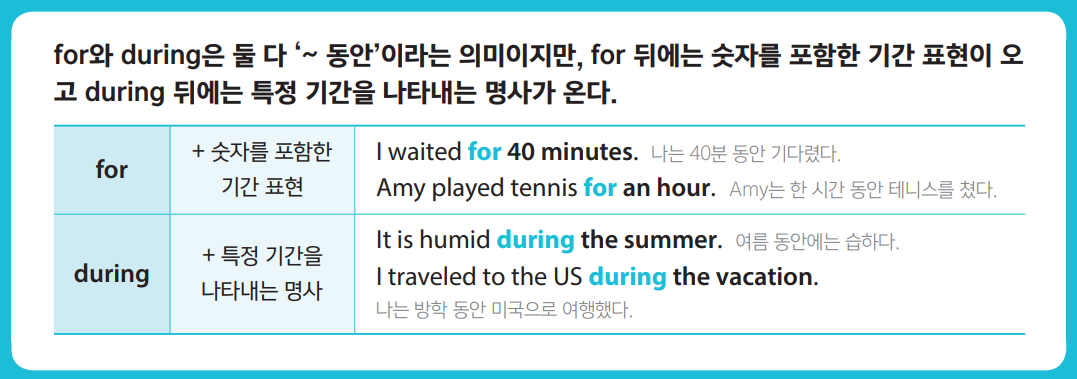 아래 사진은 중1 영문법 교재에 나온 설명 부분입니다. 영어를 어느 정도 공부했다면 대부분 이렇게 알고 있지 않을까 싶습니다. 숫자 앞에는 for를 쓰고 그렇지 않으면 during을 쓴다는 마치 수학 공식처럼 이해하는 경우도 있습니다.