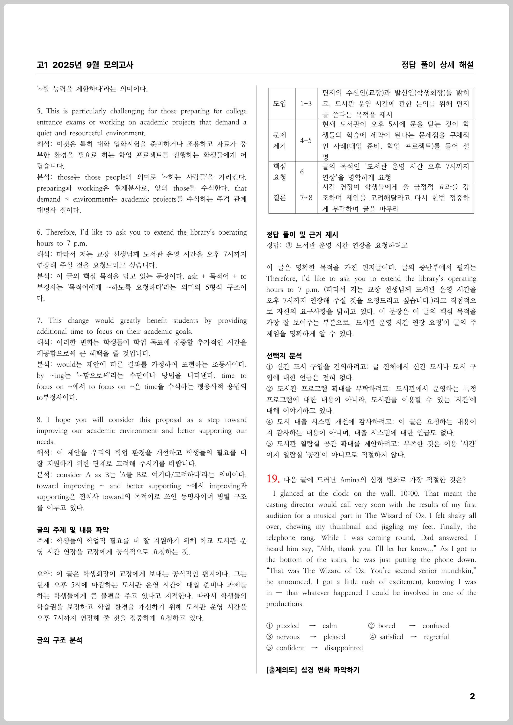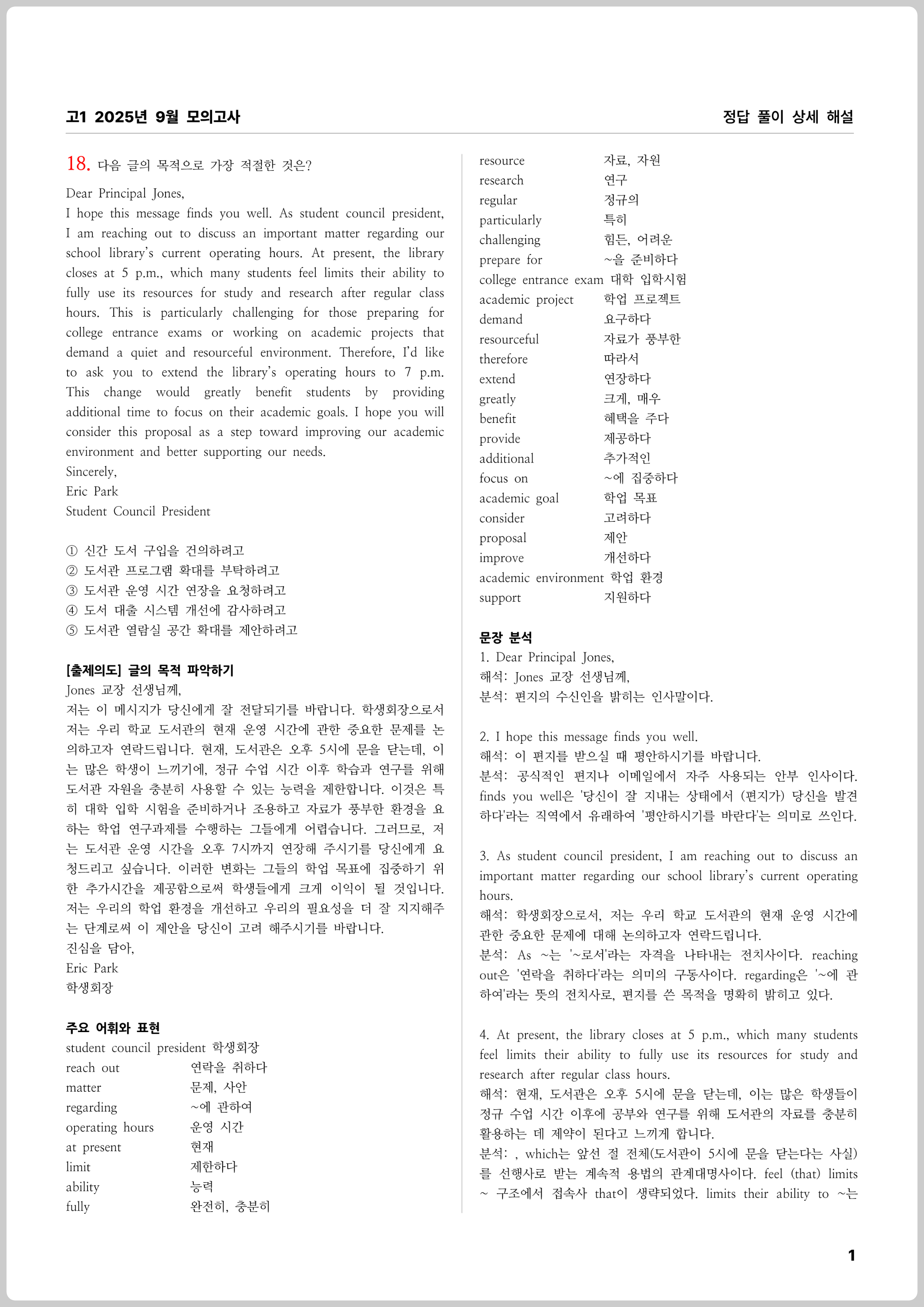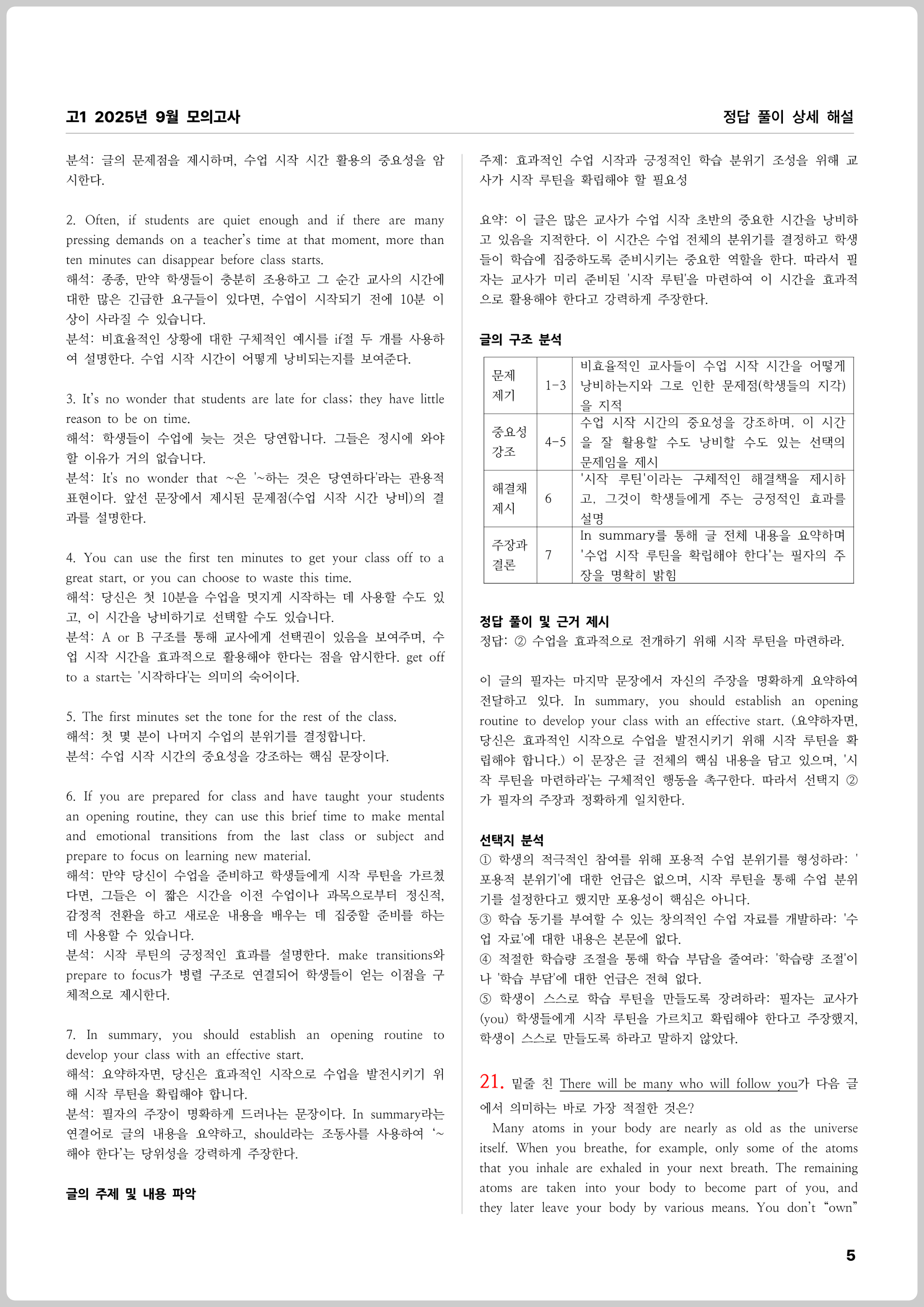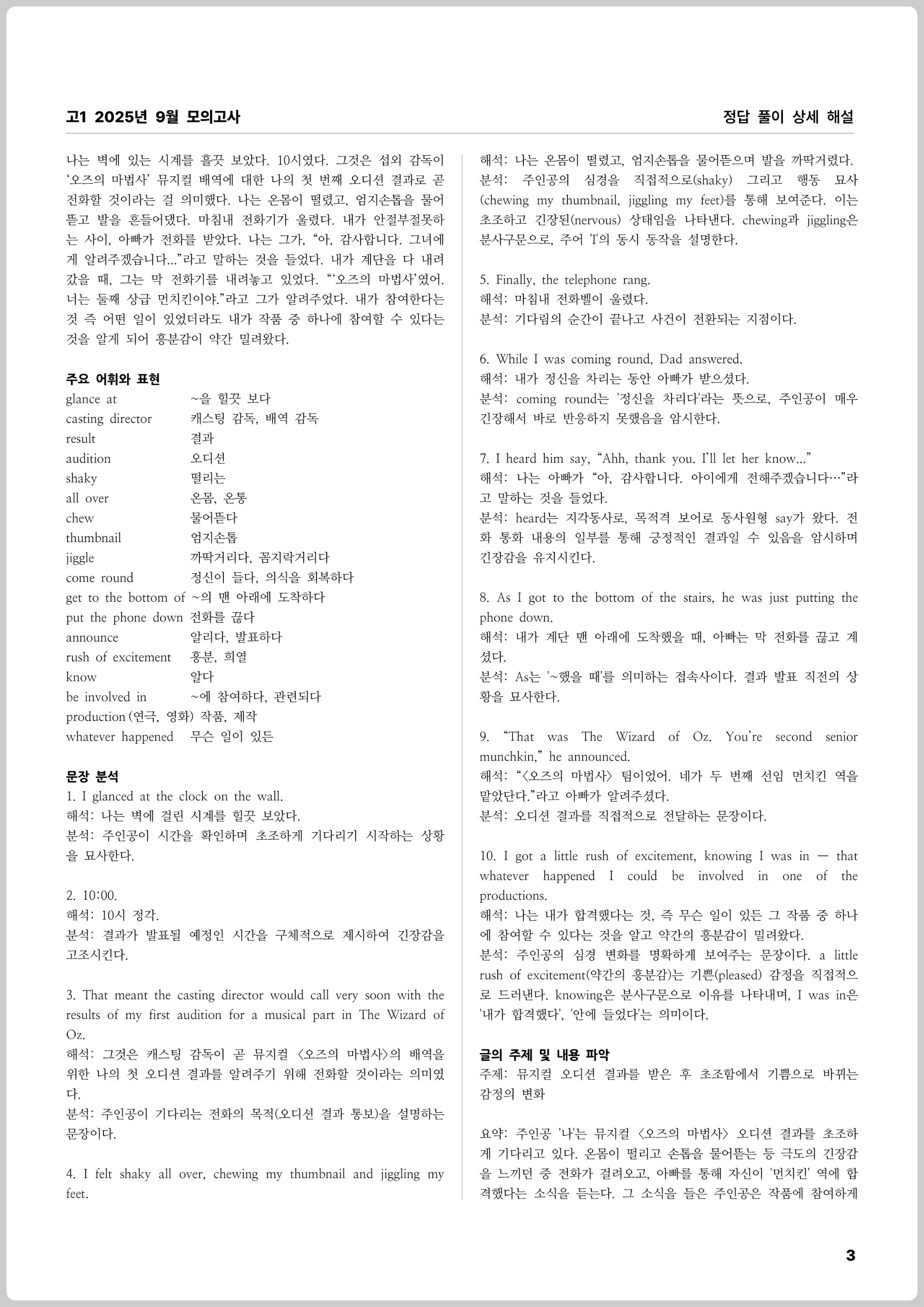 고1 2025년 9월 모의고사 상세 문제 풀이 해설집입니다. 독해 지문, 해석, 주요 어휘 정리, 주요 문장 구문 분석, 글의 주제, 글의 구조, 정답 풀이 및 근거, 선택지 해석 및 오답 풀이로 구성되어 있