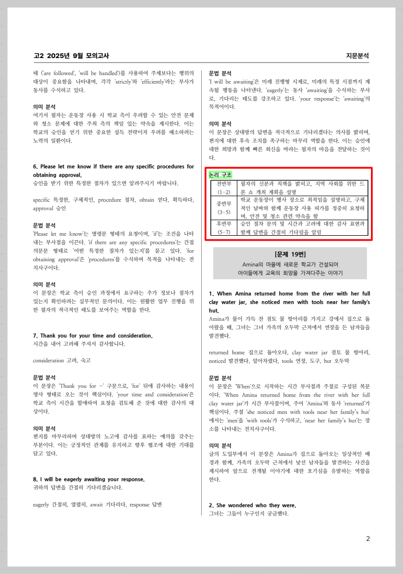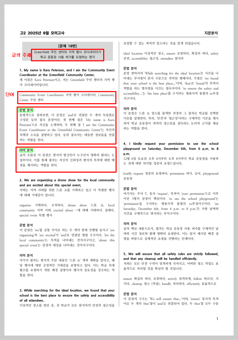고2 2025년 9월 모의고사 지문분석 자료입니다. 영어 문장 하나 하나 완벽하게 이해하고 글의 주제가 어떤 방식으로 전개되는지 알고 있어야 다양한 변형문제에도 당황하지 않고 정확한 문제 풀