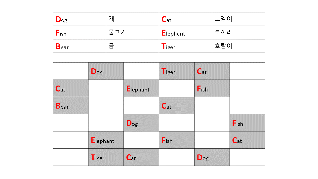 어디 동물 영단어만 있나요. 식물, 과일, 나라, 수도, 공룡, 교통수단, 아이돌 등등 세상의 모든 것들이 게임의 소재입니다. 심지어는 과자, 음료수, 화장품과 같은 기업의 제품이나 서비스로도 얼마든지 확장이 가능하겠죠. 두뇌 자극이라는 측면에서는 어린 아이 두뇌개부터 어르신들의 치매 예방을 위해서도 다양하게 활용할 수 있지 않을까 싶네요. 위의 문제를 한번 풀어보시고 첨부한 정답과 맞춰보시기 바랍니다.