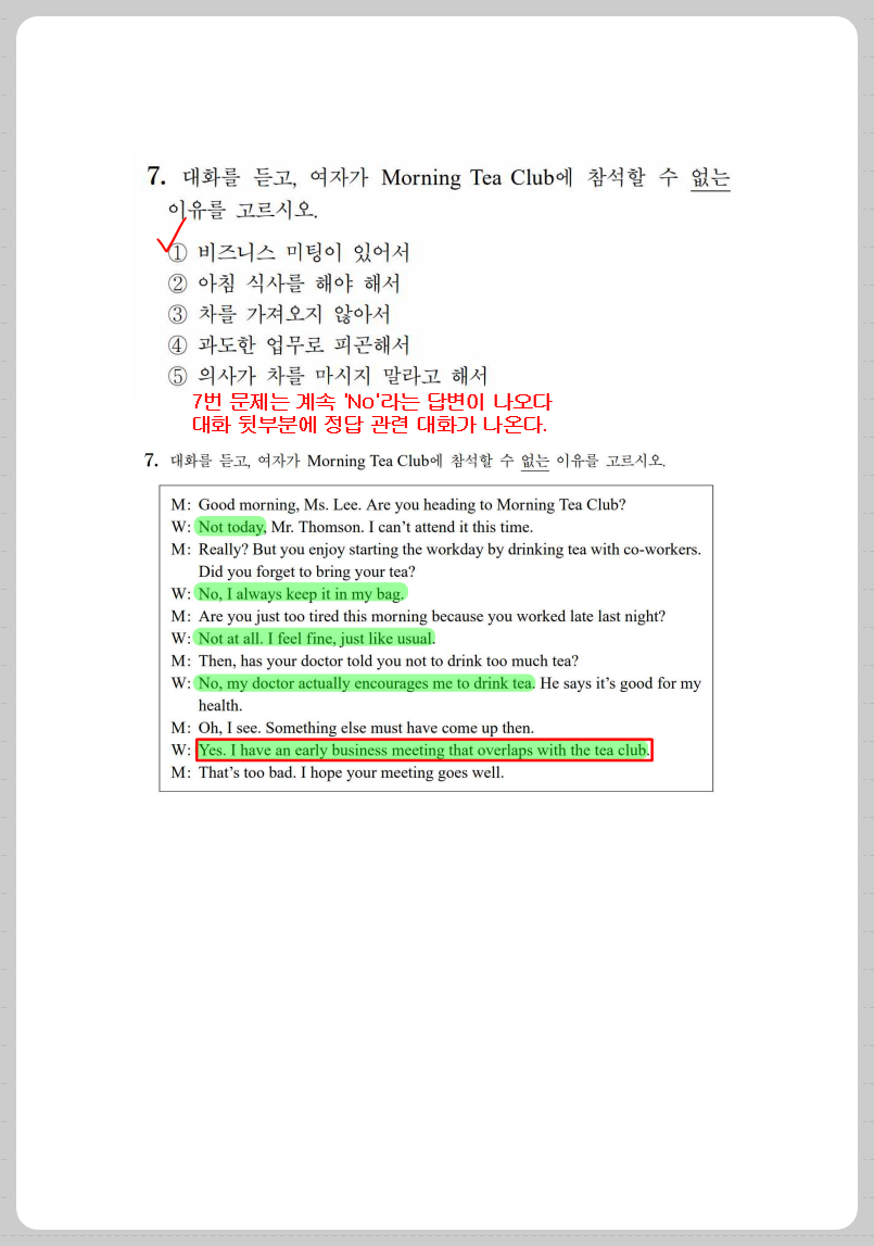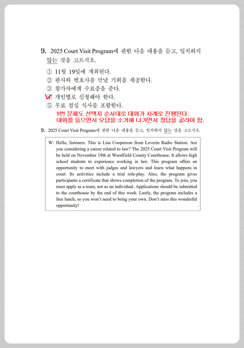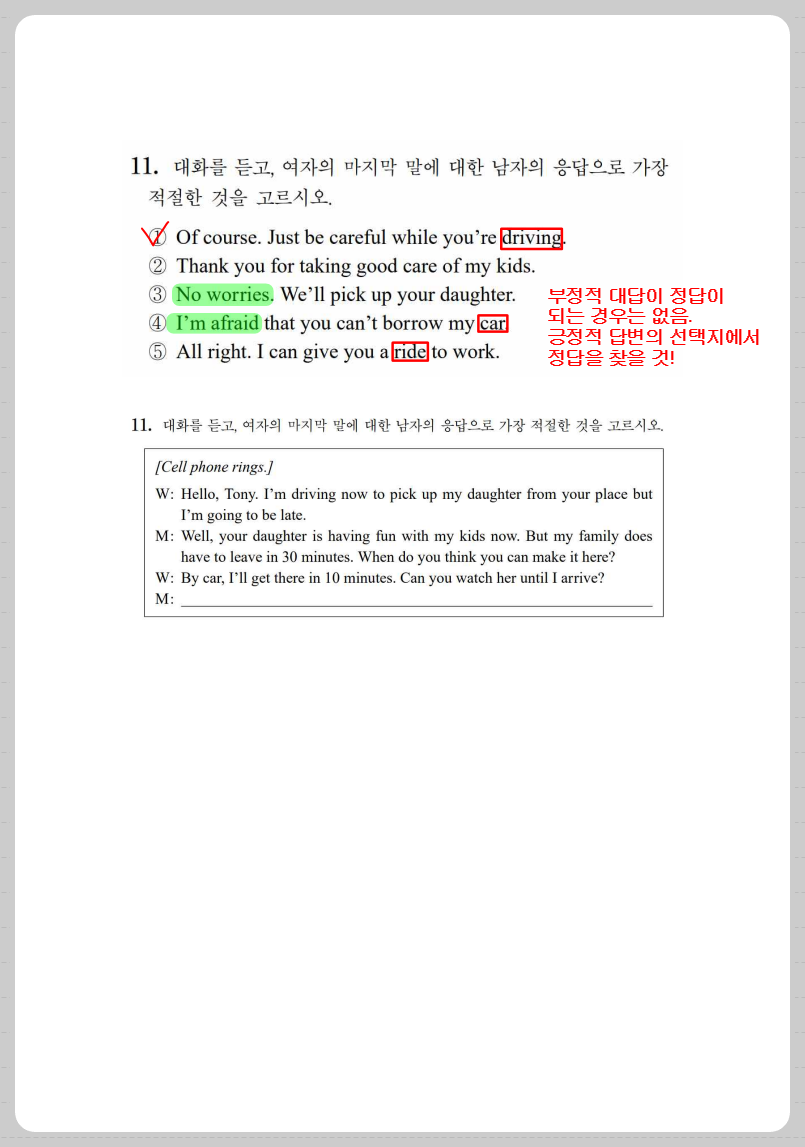 듣기 문제 유형마다접근하는 방법이 조금씩 다르니이를 숙지하고 기출 문제 혹은모의고사 문제를 풀어보시기 바랍니다.