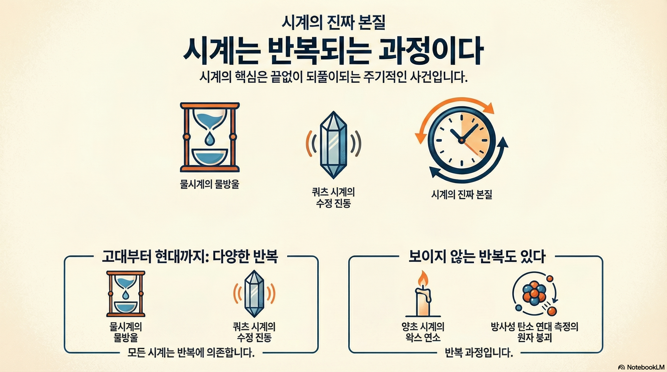 💡 핵심 의미:물시계와 수정 시계는 반복 과정을 통해 작동하는 시계의 예시다.