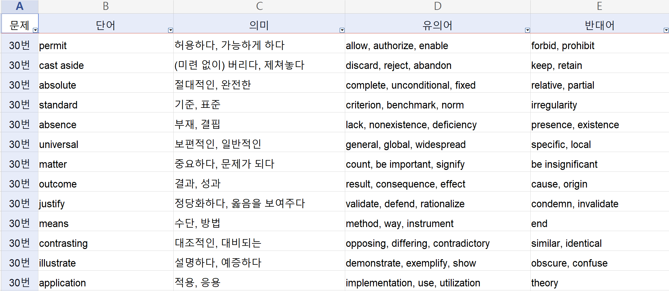 동의어를 보면서 비슷한 성격의 단어라고 그룹화 시켜 암기하면 좋습니다.
