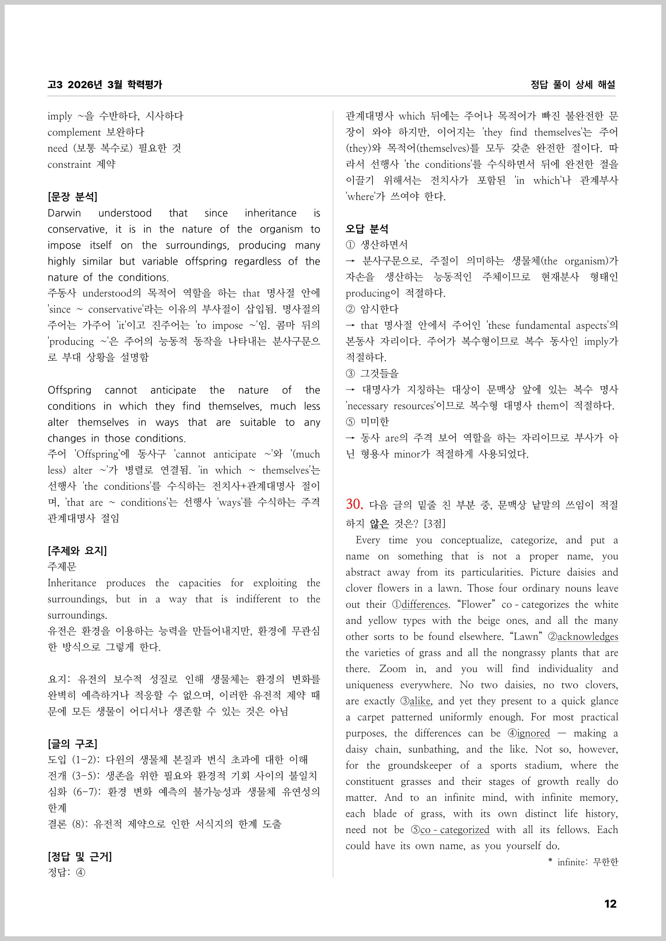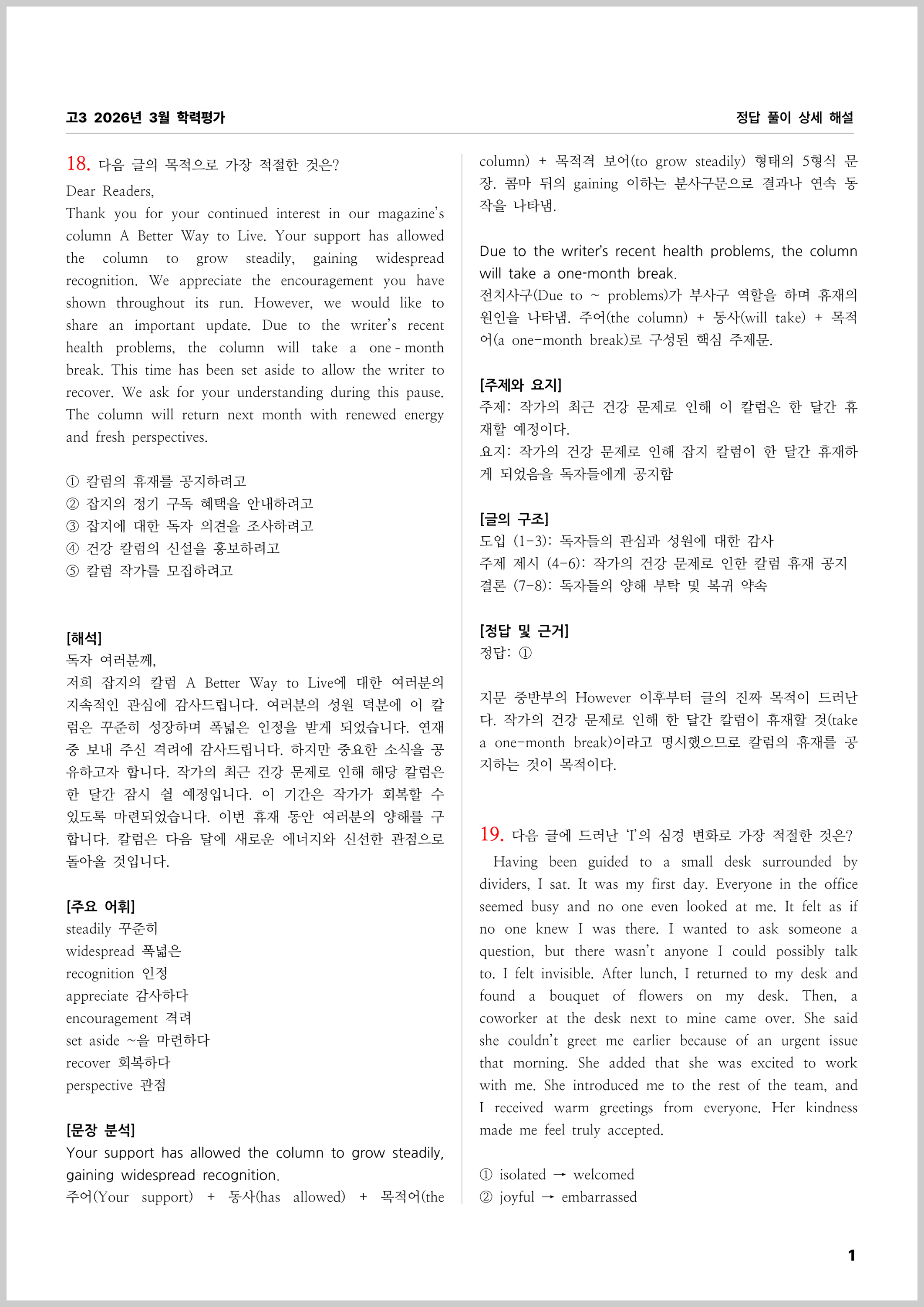 고3 2026년 3월 학력평가 문제풀이 해설 자료입니다. 문제와 해석, 주요 어휘 및 주요 구문 분석, 글의 주제(문)와 요지, 글의 논리 구조 전개, 정답의 근거와 오답 이유까지 상세하게 분석했습니다