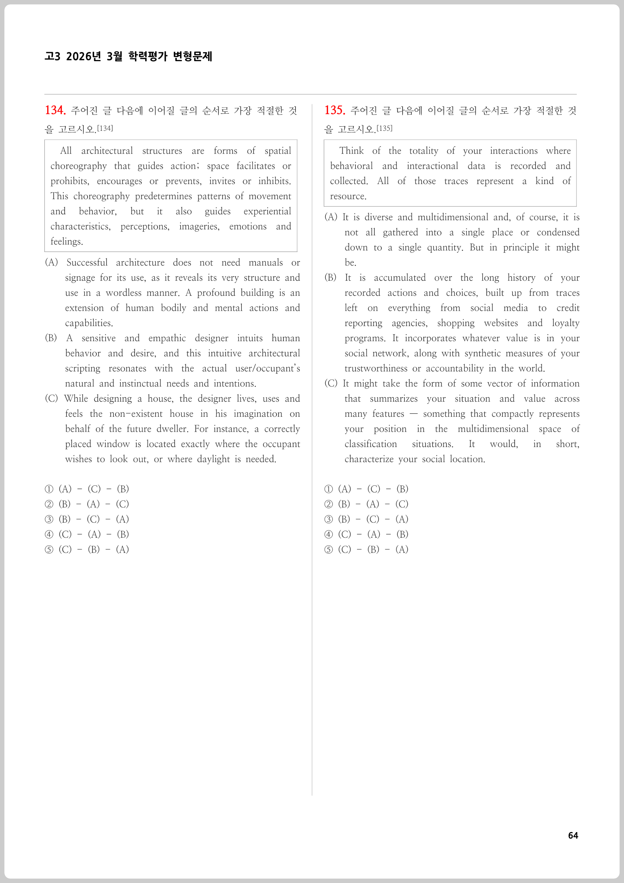 - 수능형 전 유형 마스터: 주장 찾기, 요지 파악, 빈칸 추론, 순서 배열, 문장 삽입 등 실제 시험에 출제되는 모든 유형을 꼼꼼하게 망라했습니다.