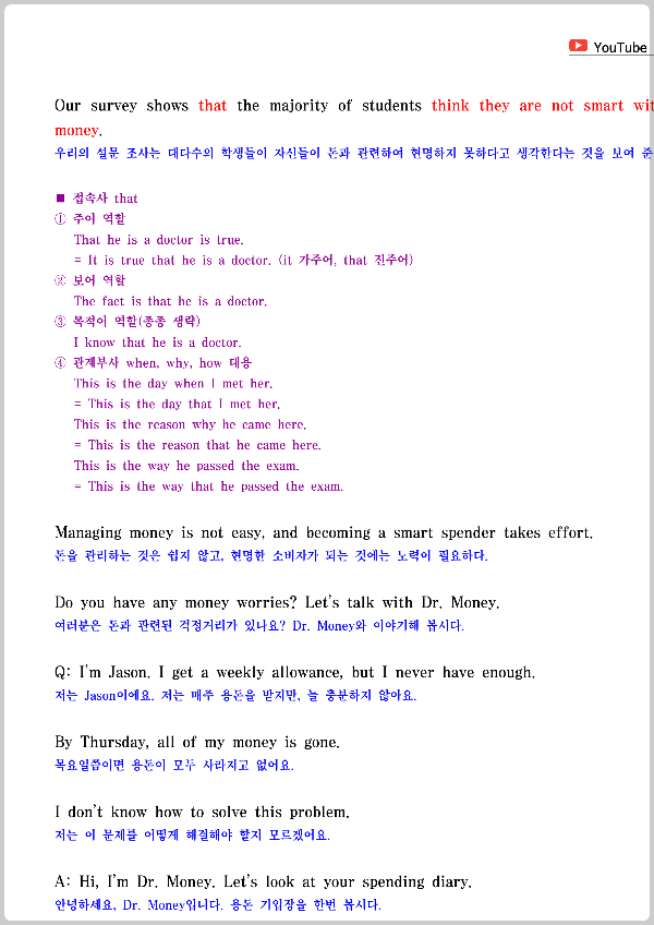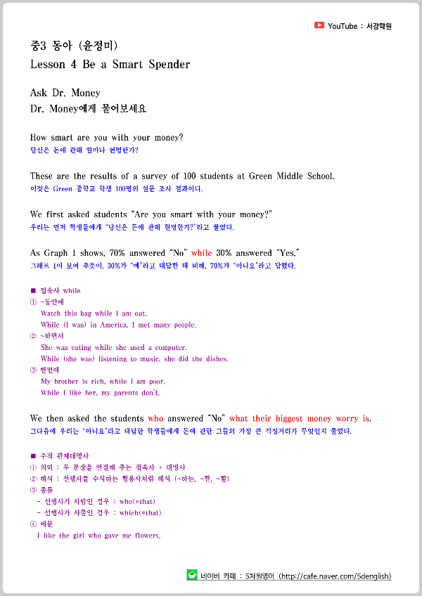대화문에 이어서 교과서 본문도 원어민의 음성으로 듣고 보면서 공부하는 것을 추천합니다. 텍스트를 보는 것도 중요하지만 듣고 따라 하는 연습도 병행해 주어야 고른 영어 실력을 유지할 수 있기 때문입니다. 첨부한 본문 자료에는 주요 문장에 사용된 문법 설명이 달려 있으니 관련 내용은 확실하게 익혀두시면 좋겠습니다.